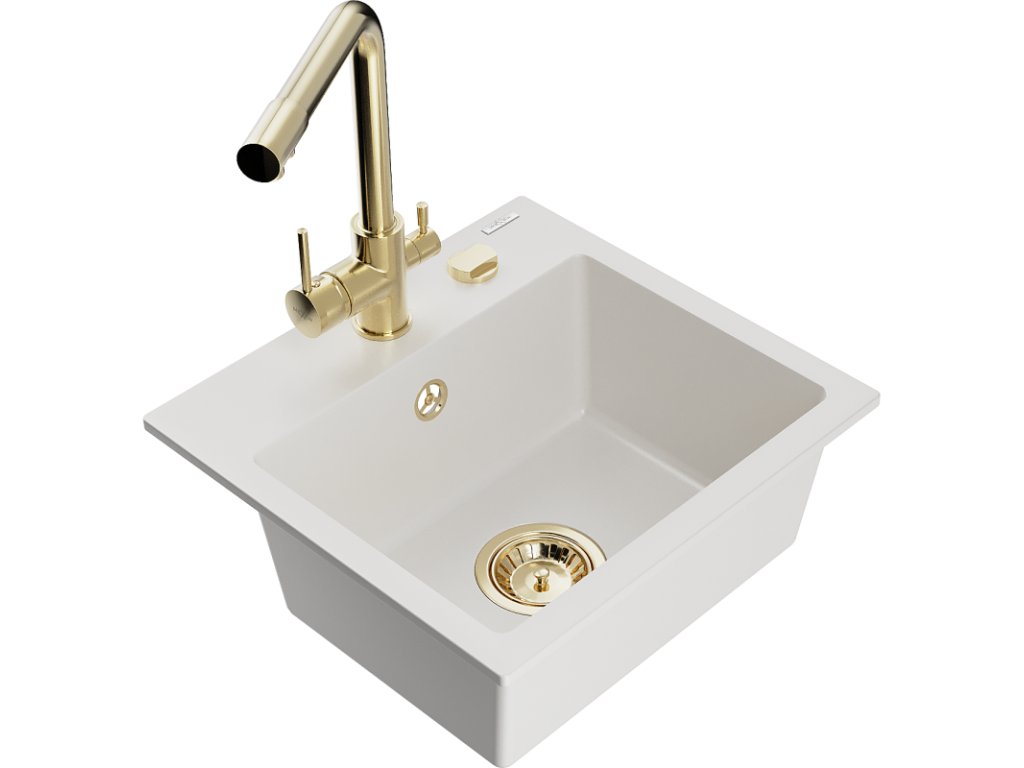 Granitový drez Mexen Milo s 1 misou a kuchynskou batériou Duero, biely - 6505-20-671600-50
