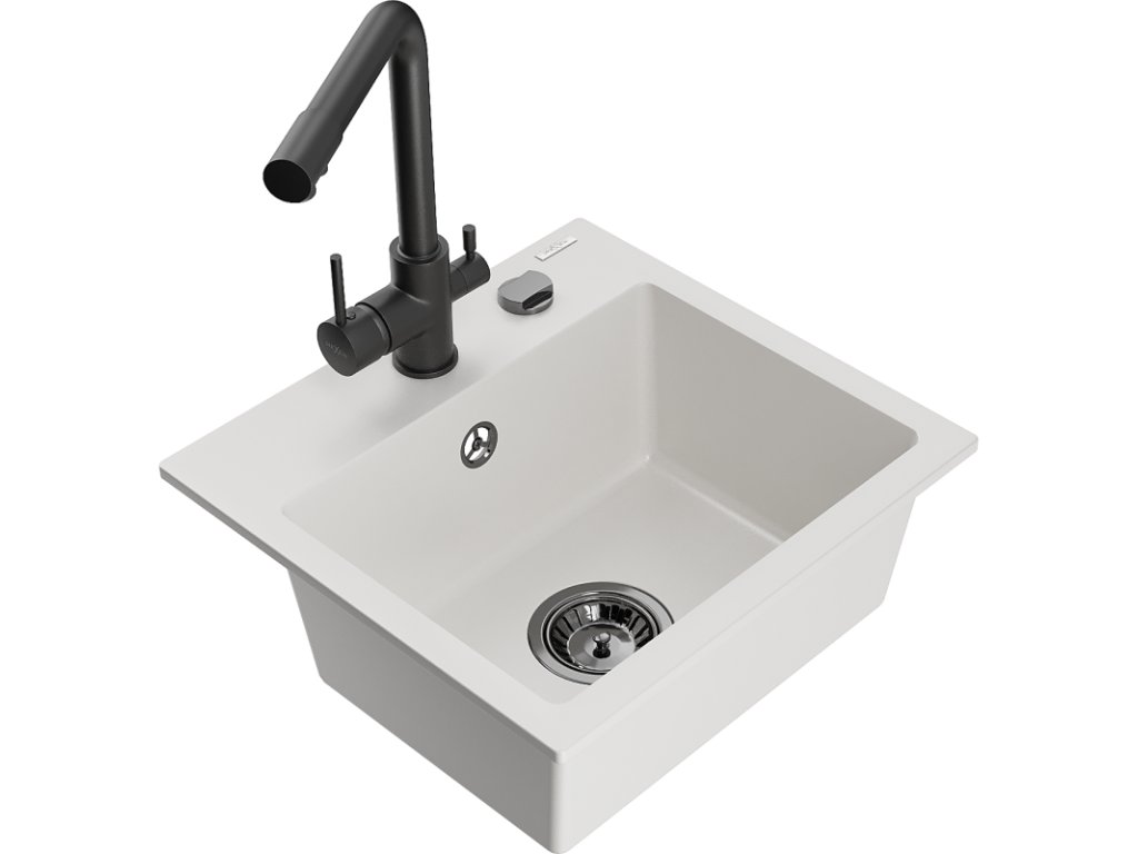Granitový drez Mexen Milo s 1 misou a kuchynskou batériou Duero, biely - 6505-20-671600-70