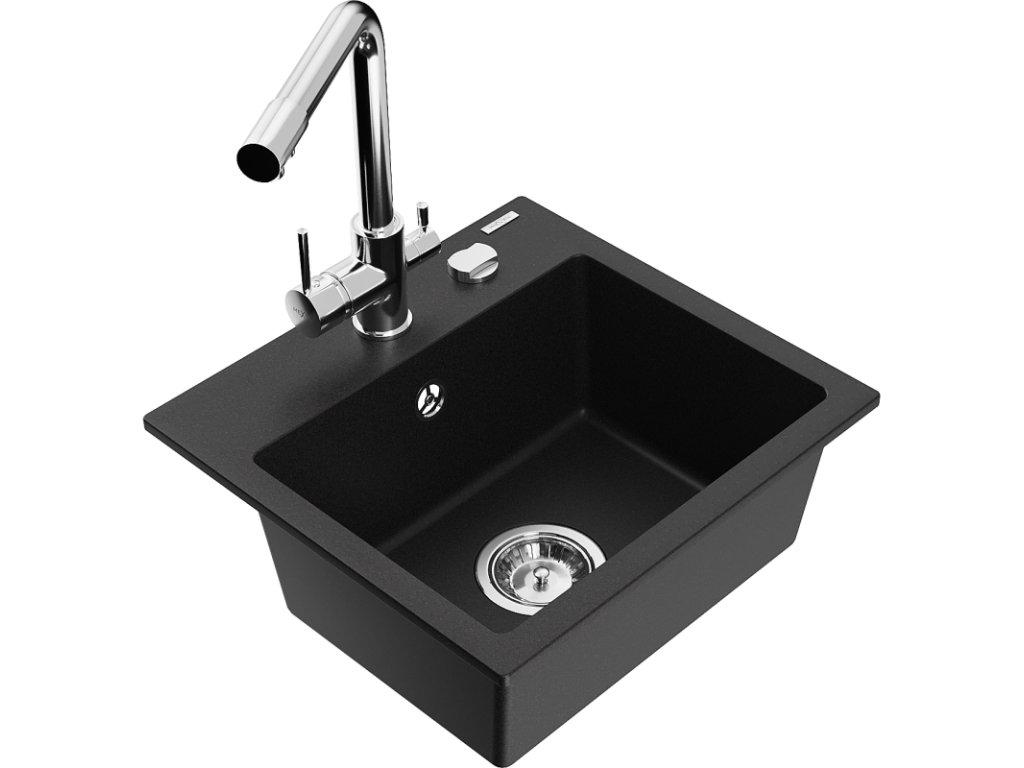 Granitový drez Mexen Milo s 1 misou a kuchynskou batériou Duero, čierny - 6505-77-671600-00