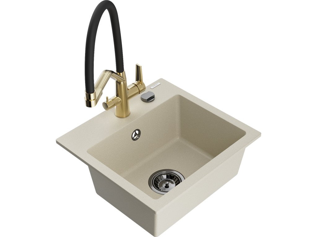 Granitový drez Mexen Milo s 1 misou a kuchynskou batériou Duo, béžový - 6505-69-671701-57-B