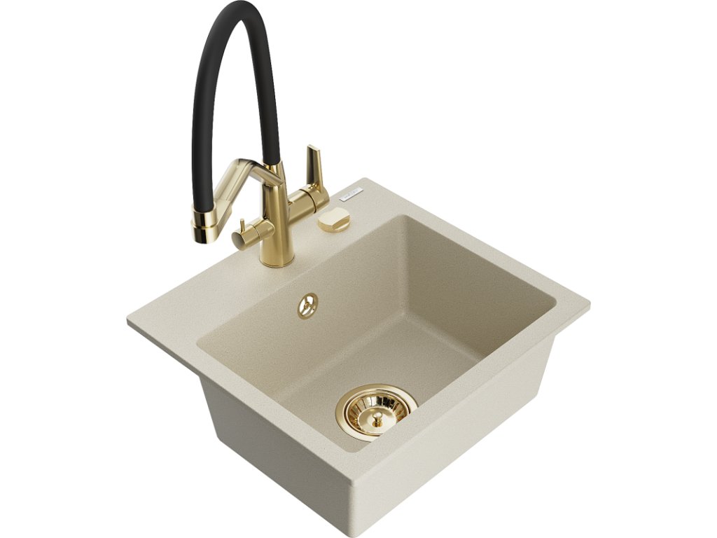 Granitový drez Mexen Milo s 1 misou a kuchynskou batériou Duo, béžový - 6505-69-671701-57-G