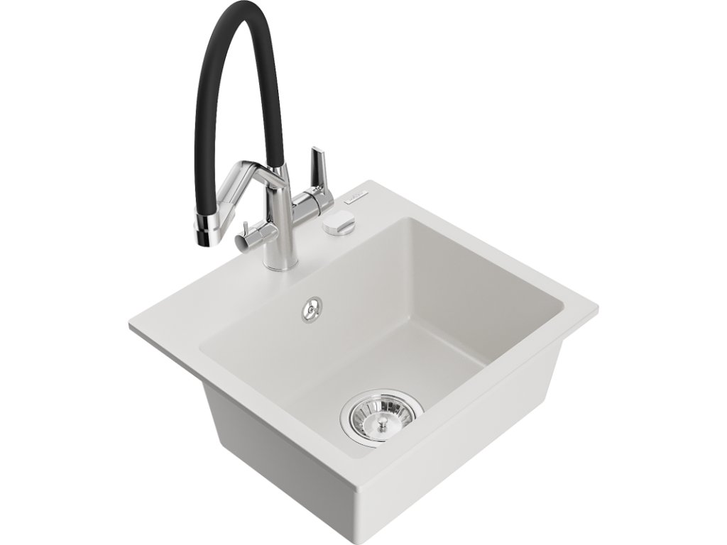Granitový drez Mexen Milo s 1 misou a kuchynskou batériou Duo, biely - 6505-20-671701-07
