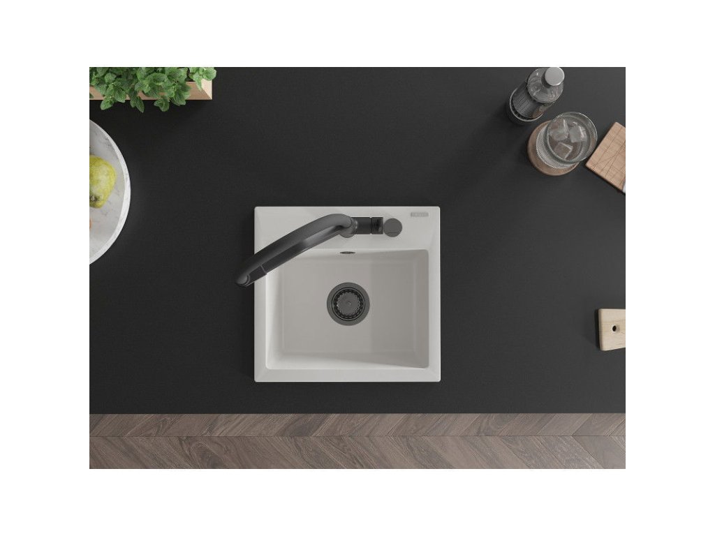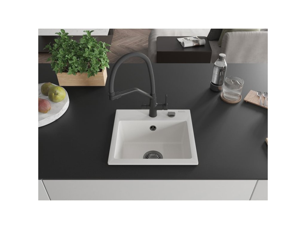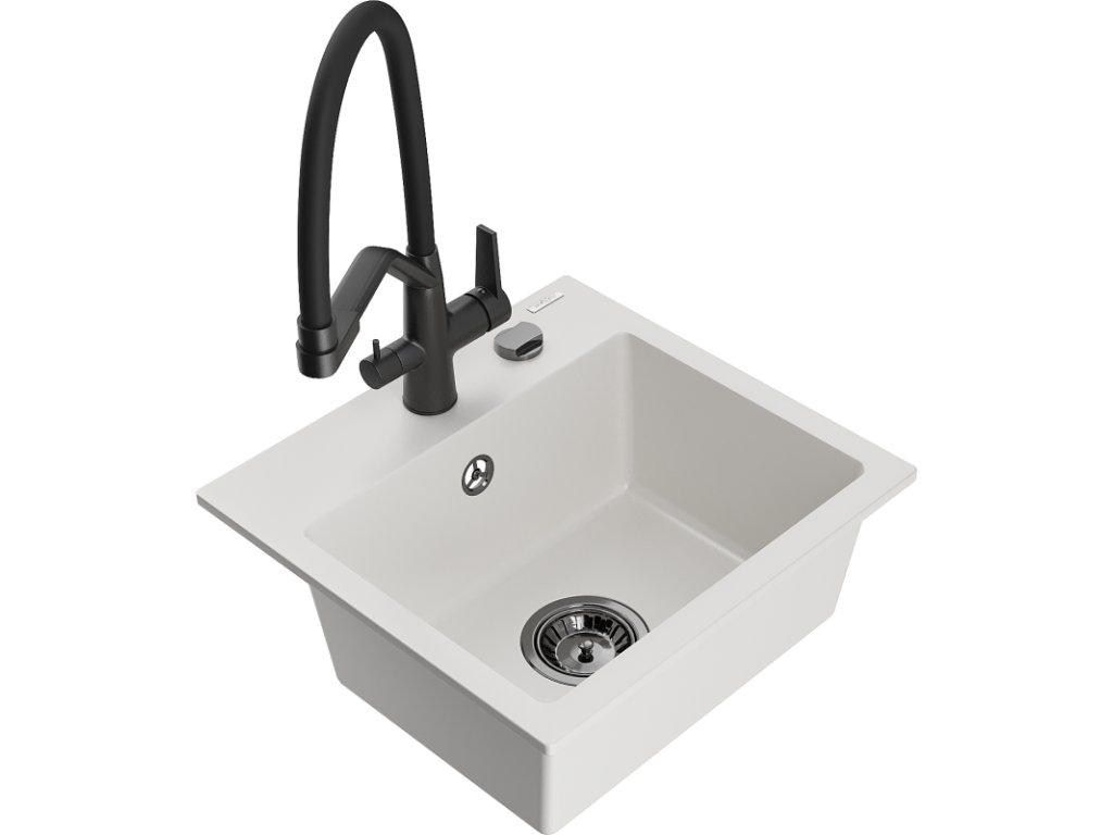 Granitový drez Mexen Milo s 1 misou a kuchynskou batériou Duo, biely - 6505-20-671701-70-B