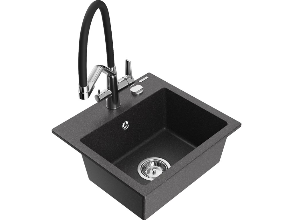 Granitový drez Mexen Milo s 1 misou a kuchynskou batériou Duo, čierna škvrnitá - 6505-76-671701-07