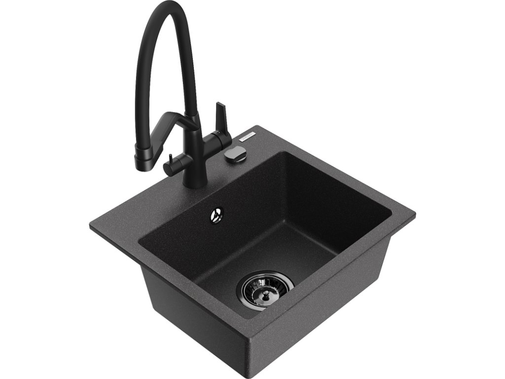Granitový drez Mexen Milo s 1 misou a kuchynskou batériou Duo, čierna škvrnitá - 6505-76-671701-70-B