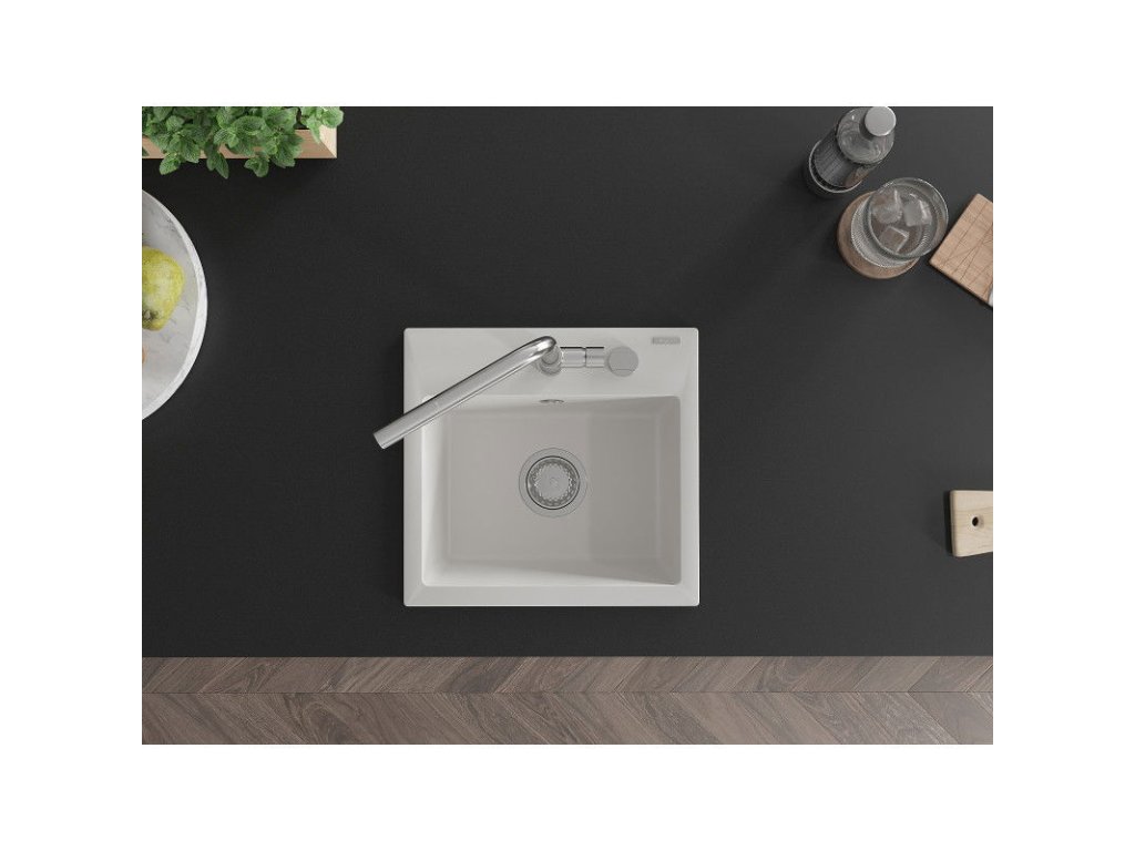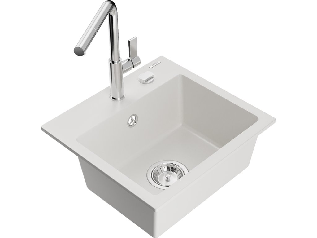 Granitový drez Mexen Milo s 1 misou a kuchynskou batériou Flora, biely - 6505-20-670401-00