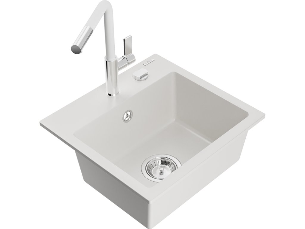 Granitový drez Mexen Milo s 1 misou a kuchynskou batériou Flora, biely - 6505-20-670401-02