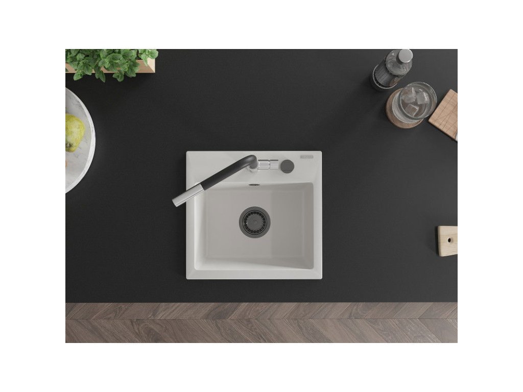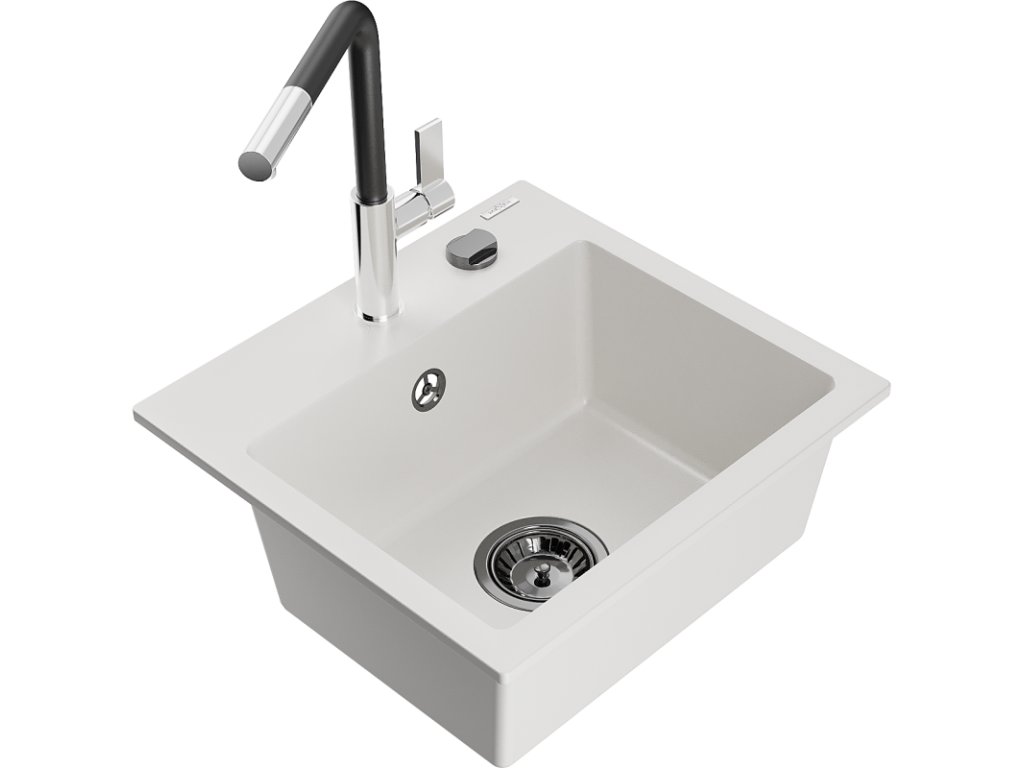 Granitový drez Mexen Milo s 1 misou a kuchynskou batériou Flora, biely - 6505-20-670401-07-B