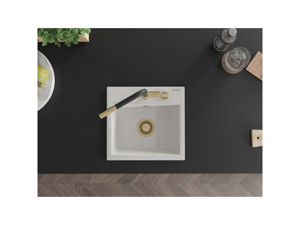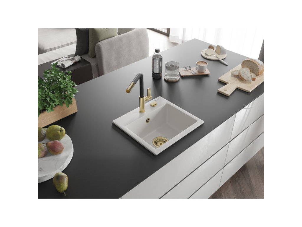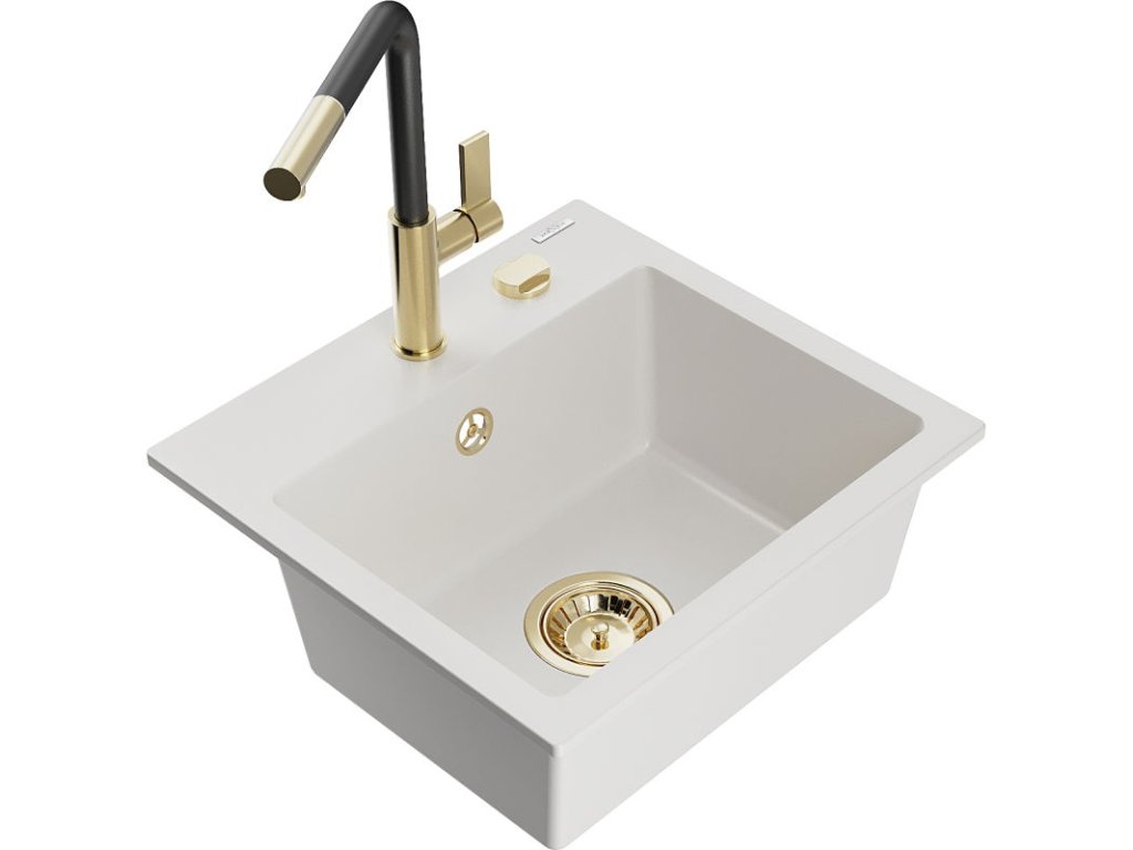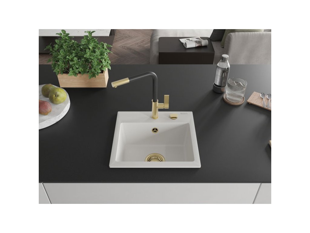 Granitový drez Mexen Milo s 1 misou a kuchynskou batériou Flora, biely - 6505-20-670401-57-G