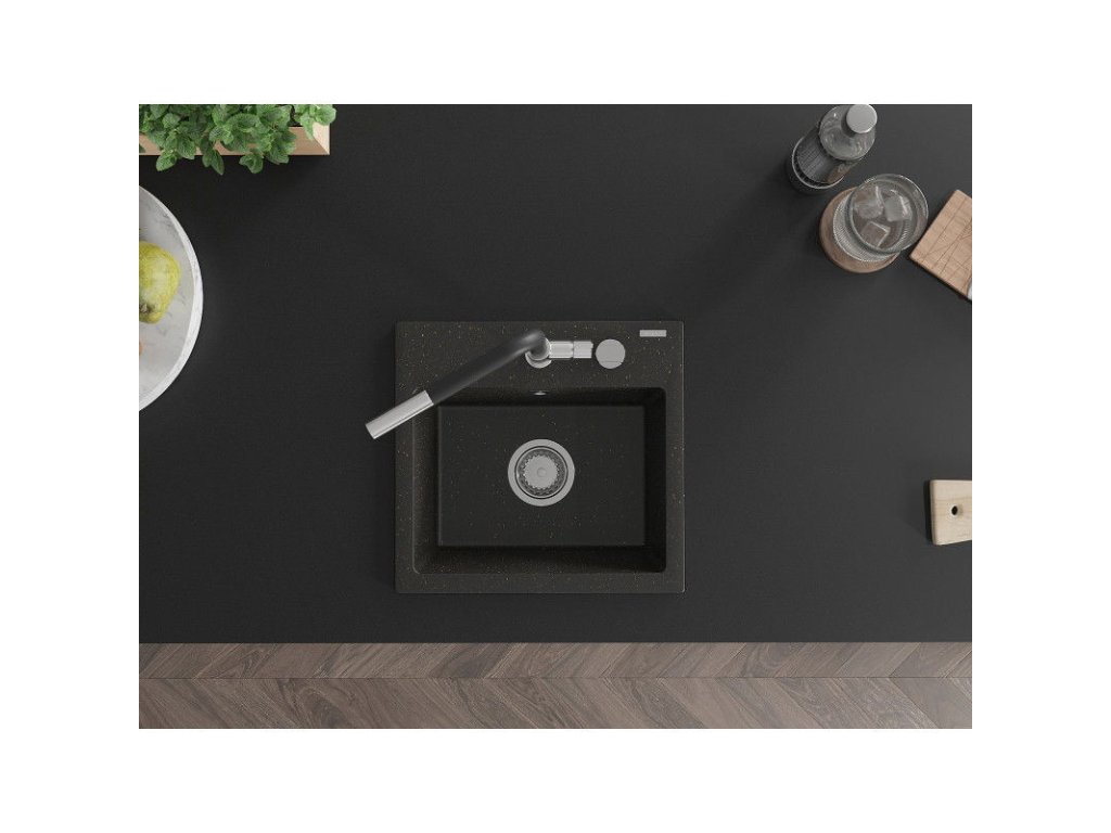 Granitový drez Mexen Milo s 1 misou a kuchynskou batériou Flora, čierna/zlatá metalíza - 6505-75-670401-07