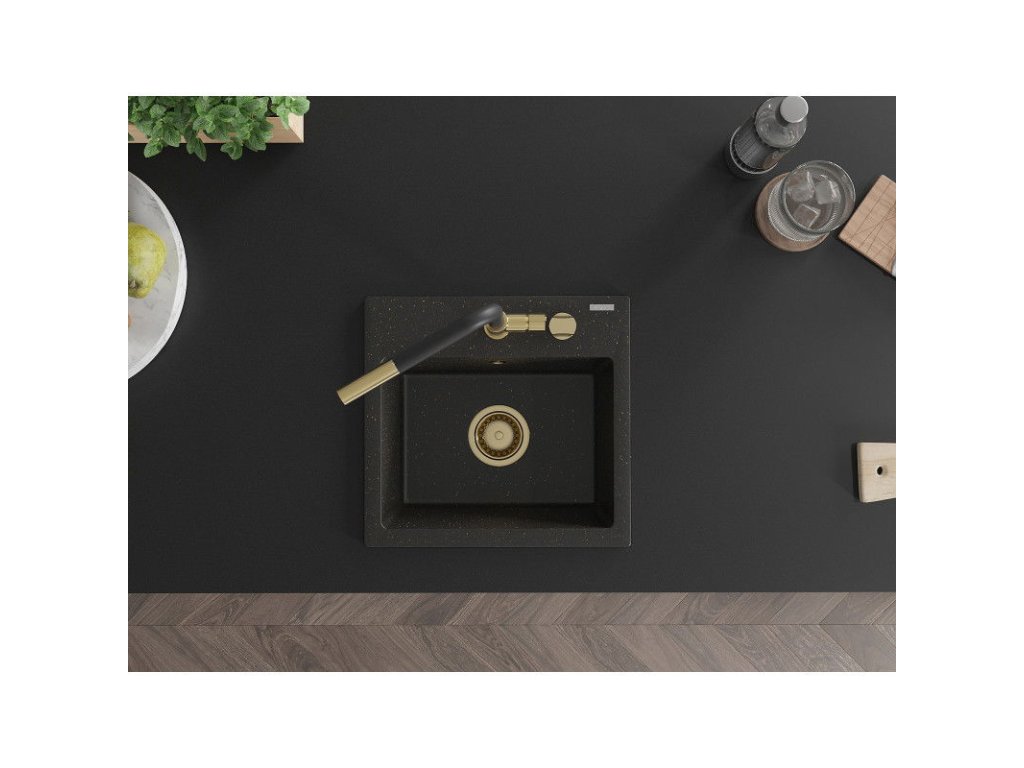 Granitový drez Mexen Milo s 1 misou a kuchynskou batériou Flora, čierna/zlatá metalíza - 6505-75-670401-57-G