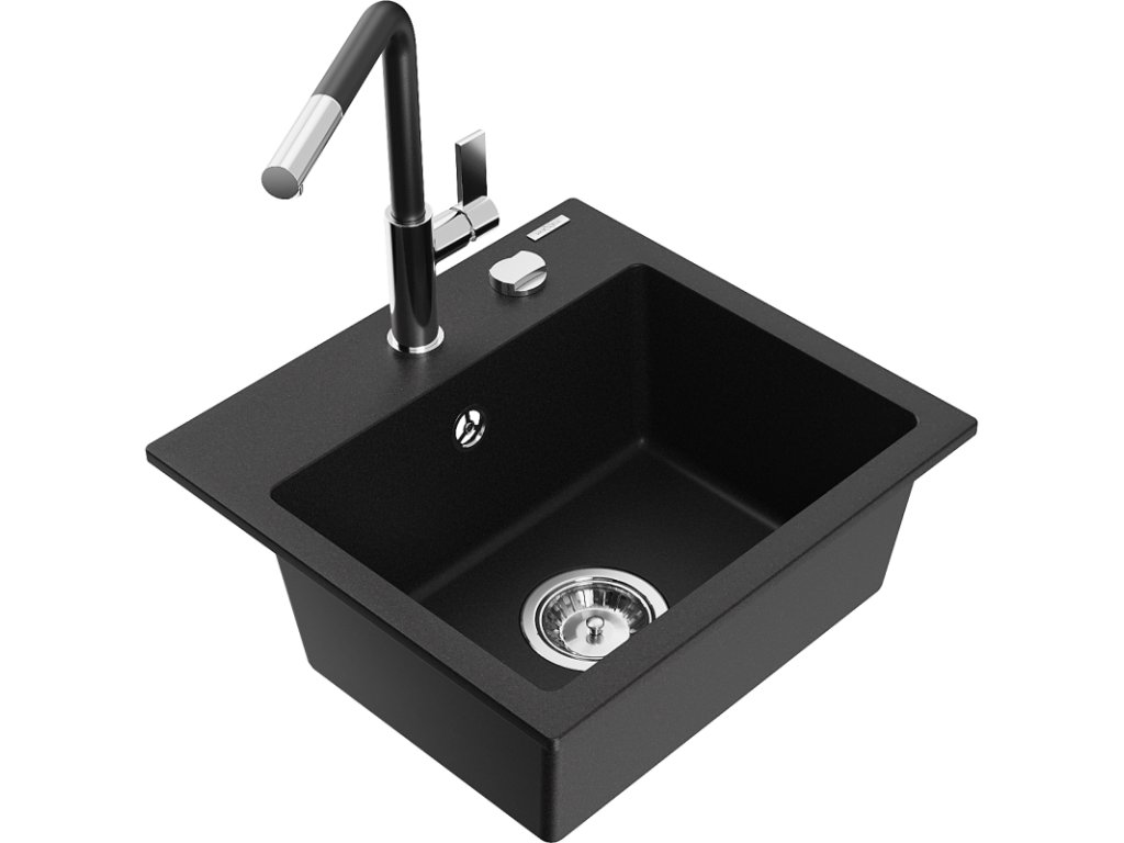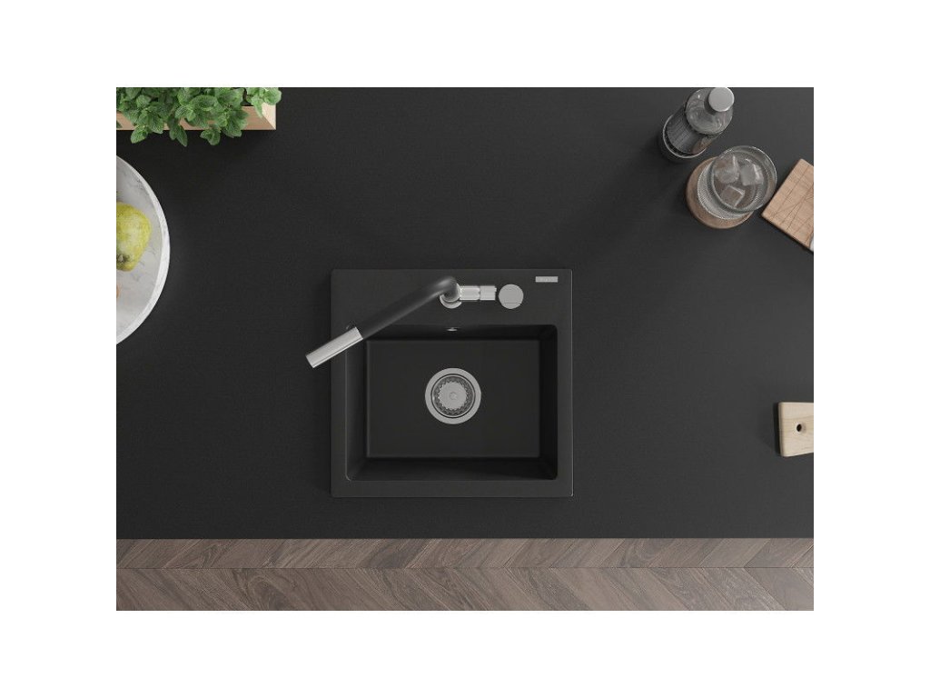 Granitový drez Mexen Milo s 1 misou a kuchynskou batériou Flora, čierny - 6505-77-670401-07