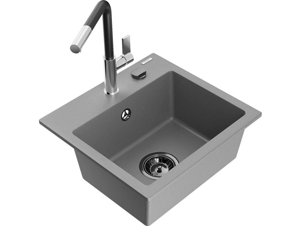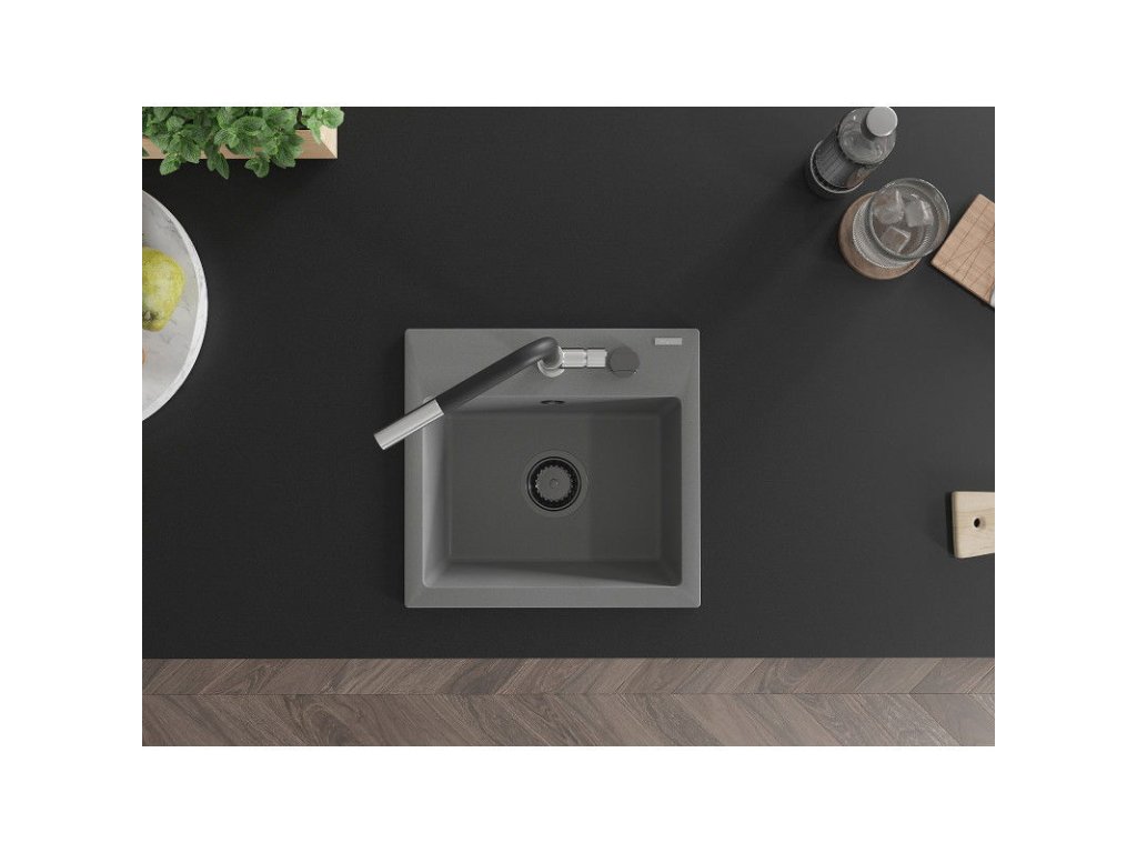 Granitový drez Mexen Milo s 1 misou a kuchynskou batériou Flora, sivý - 6505-71-670401-07-B