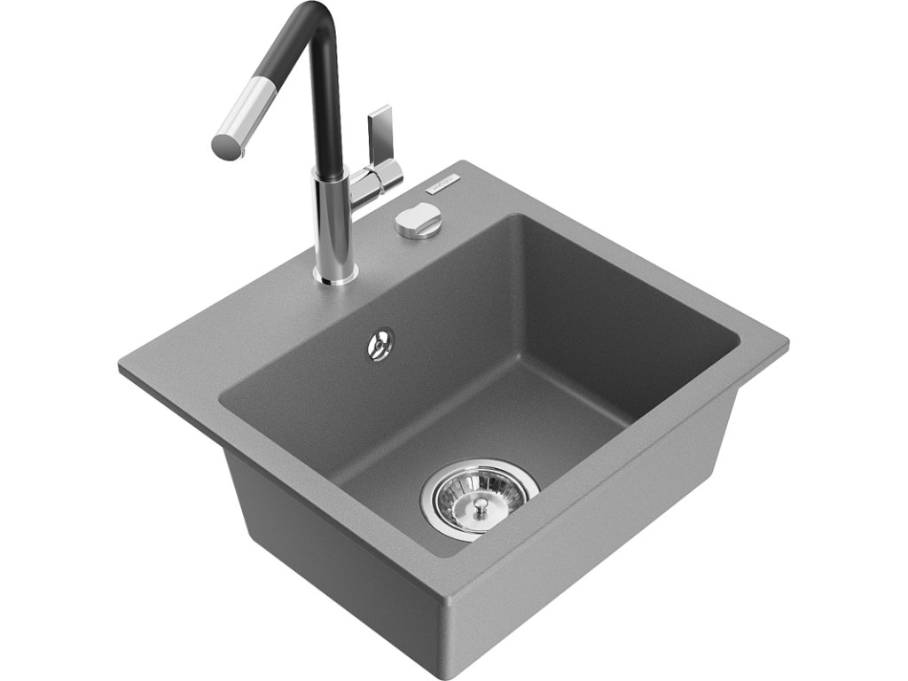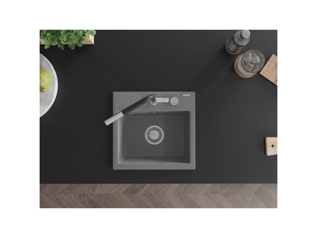 Granitový drez Mexen Milo s 1 misou a kuchynskou batériou Flora, sivý - 6505-71-670401-07