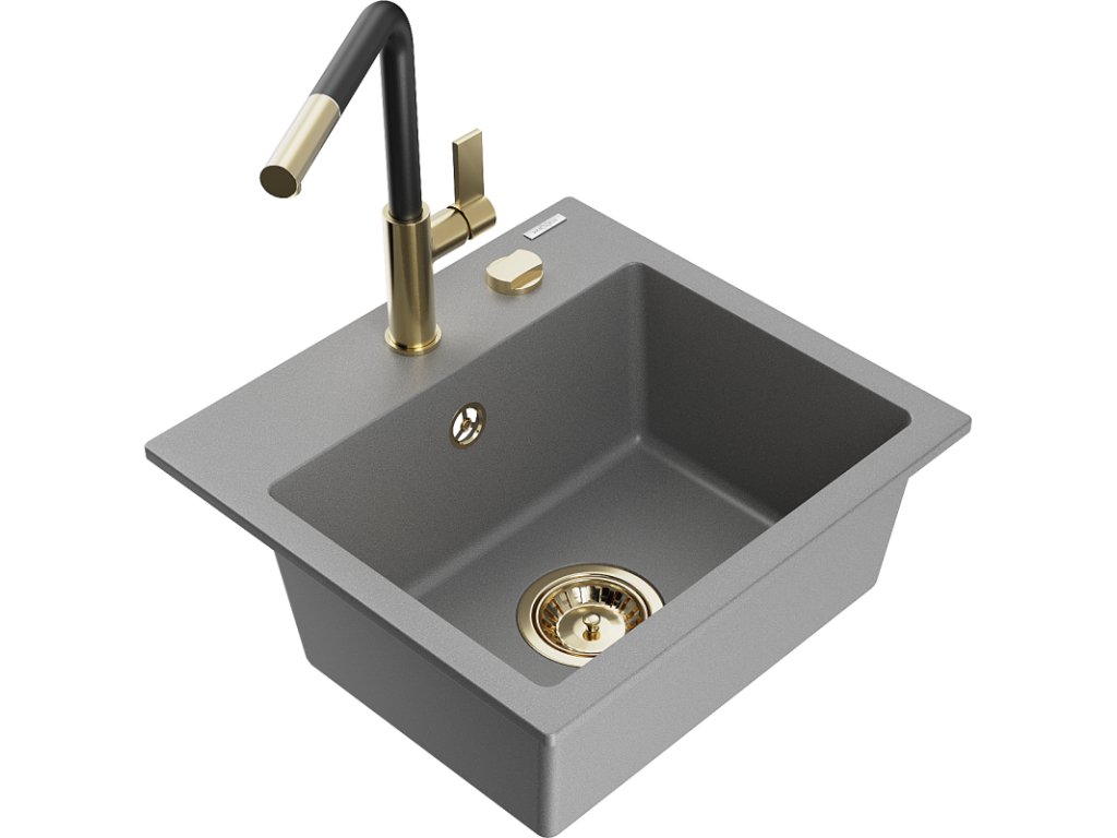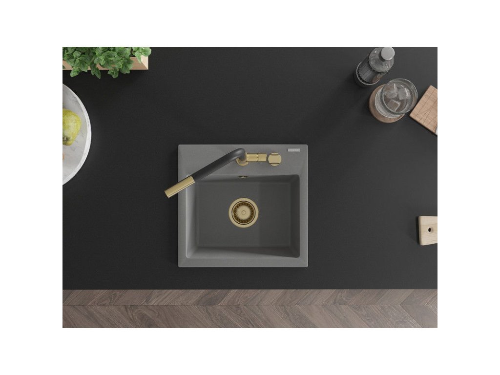 Granitový drez Mexen Milo s 1 misou a kuchynskou batériou Flora, sivý - 6505-71-670401-57-G