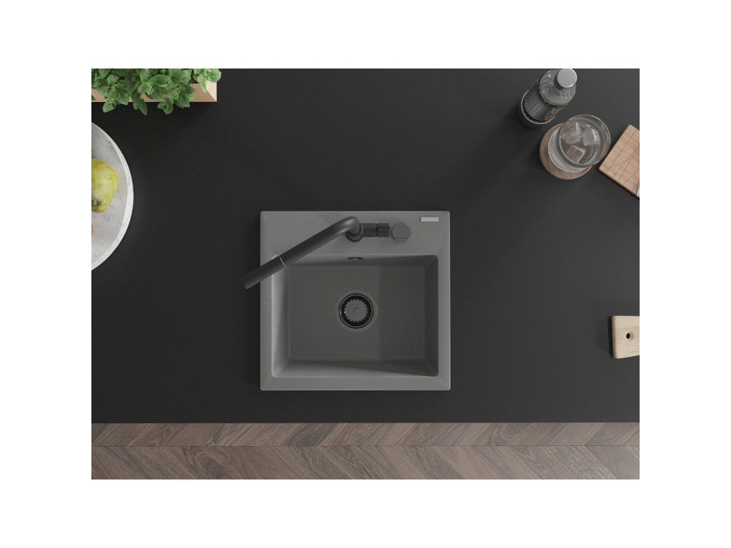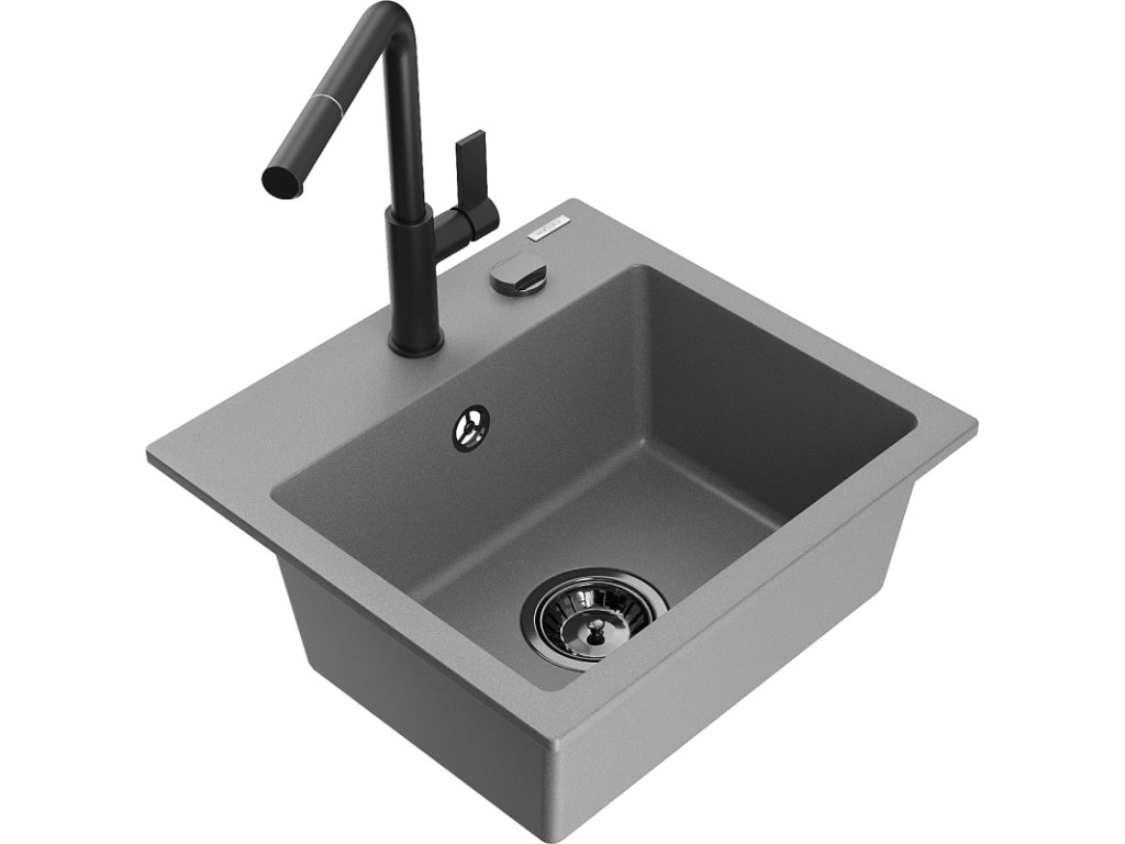 Granitový drez Mexen Milo s 1 misou a kuchynskou batériou Flora, sivý - 6505-71-670401-70-B