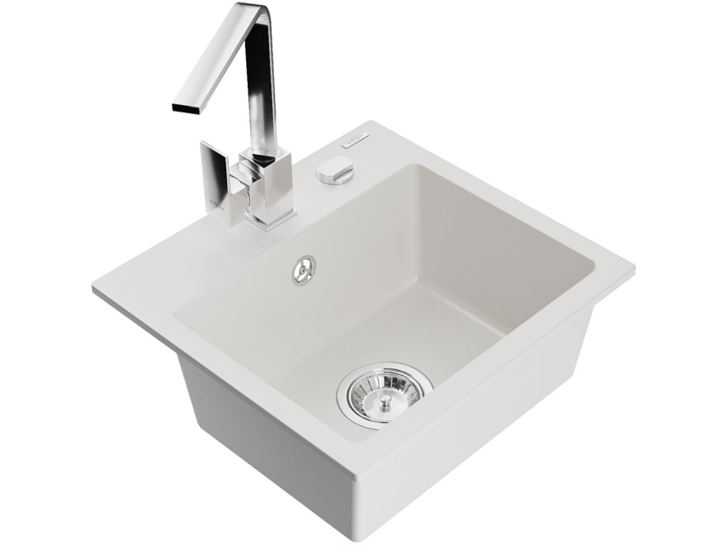 Granitový drez Mexen Milo s 1 misou a kuchynskou batériou Rita, biely - 6505-20-670300-00