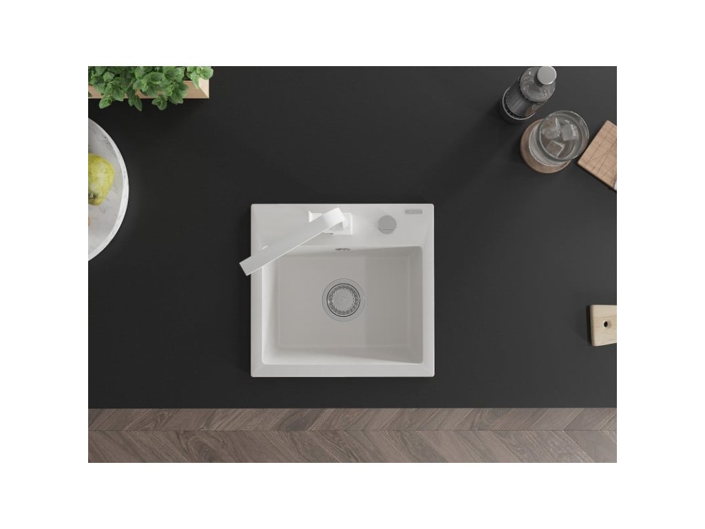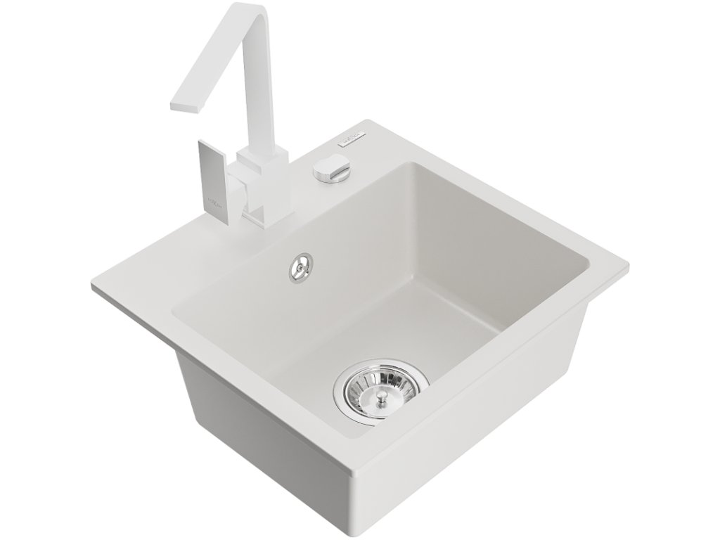 Granitový drez Mexen Milo s 1 misou a kuchynskou batériou Rita, biely - 6505-20-670300-20