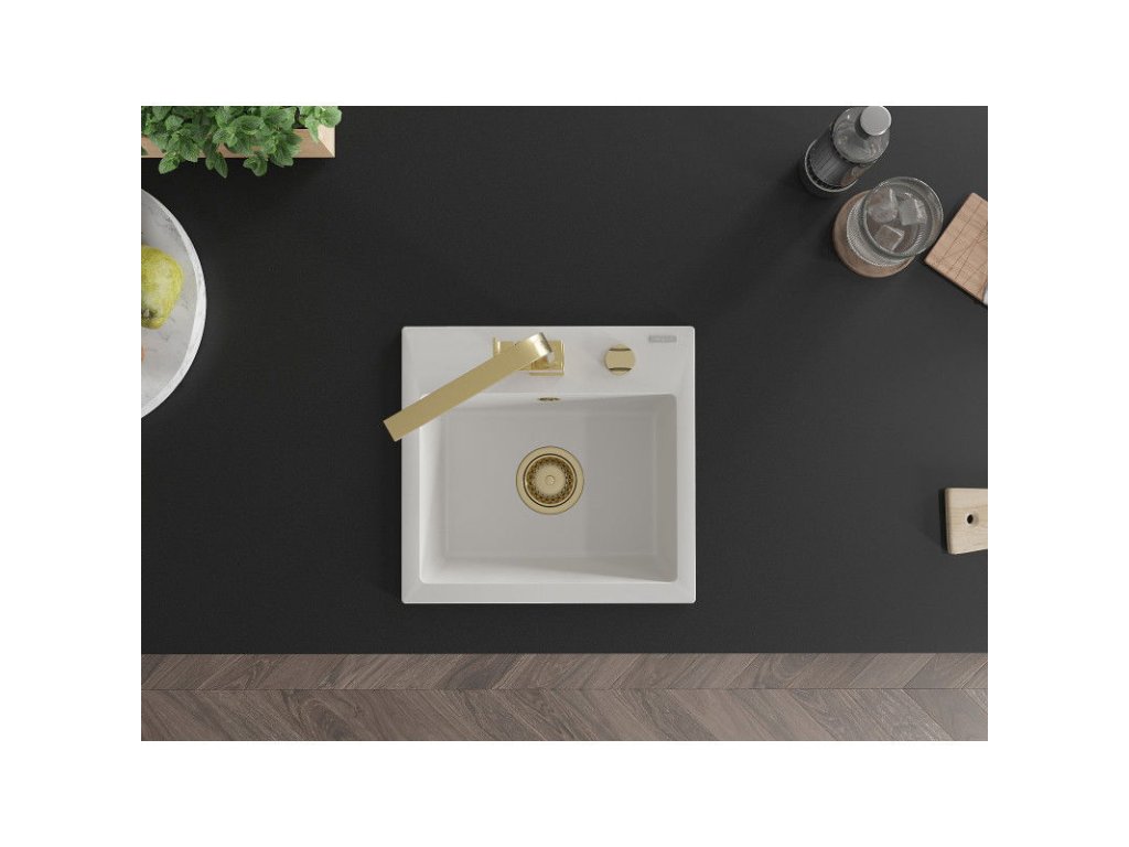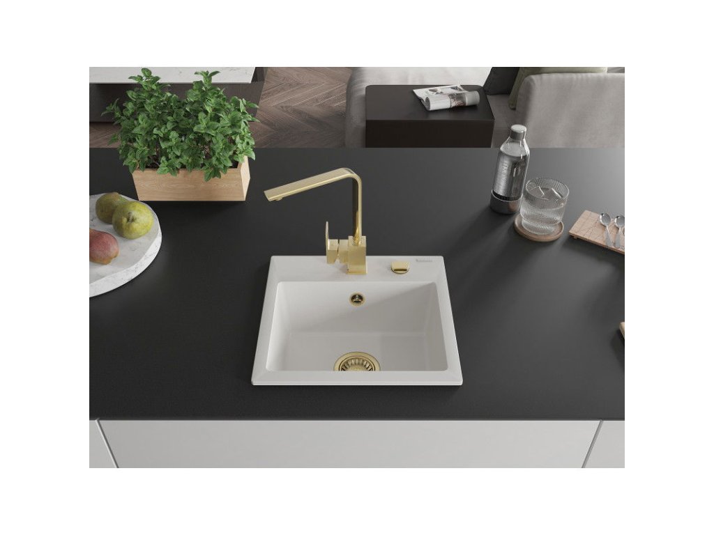 Granitový drez Mexen Milo s 1 misou a kuchynskou batériou Rita, biely - 6505-20-670300-50