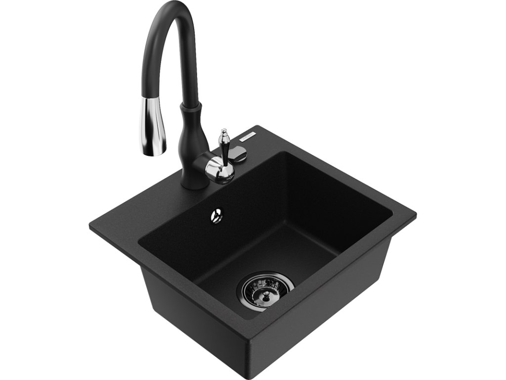 Granitový drez Mexen Milo s 1 misou a kuchynskou batériou Savita, čierny - 6505-77-672601-70-B
