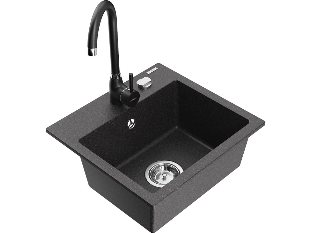 Granitový drez Mexen Milo s 1 misou a kuchynskou batériou Telma, čierna škvrna - 6505-76-670200-70