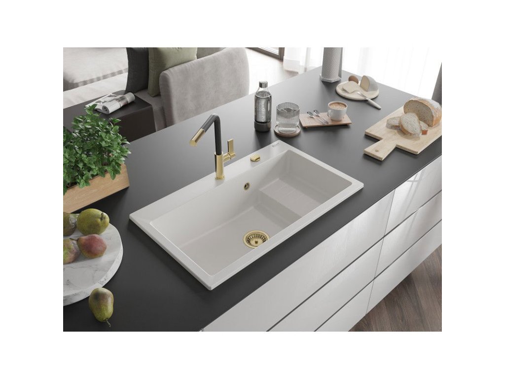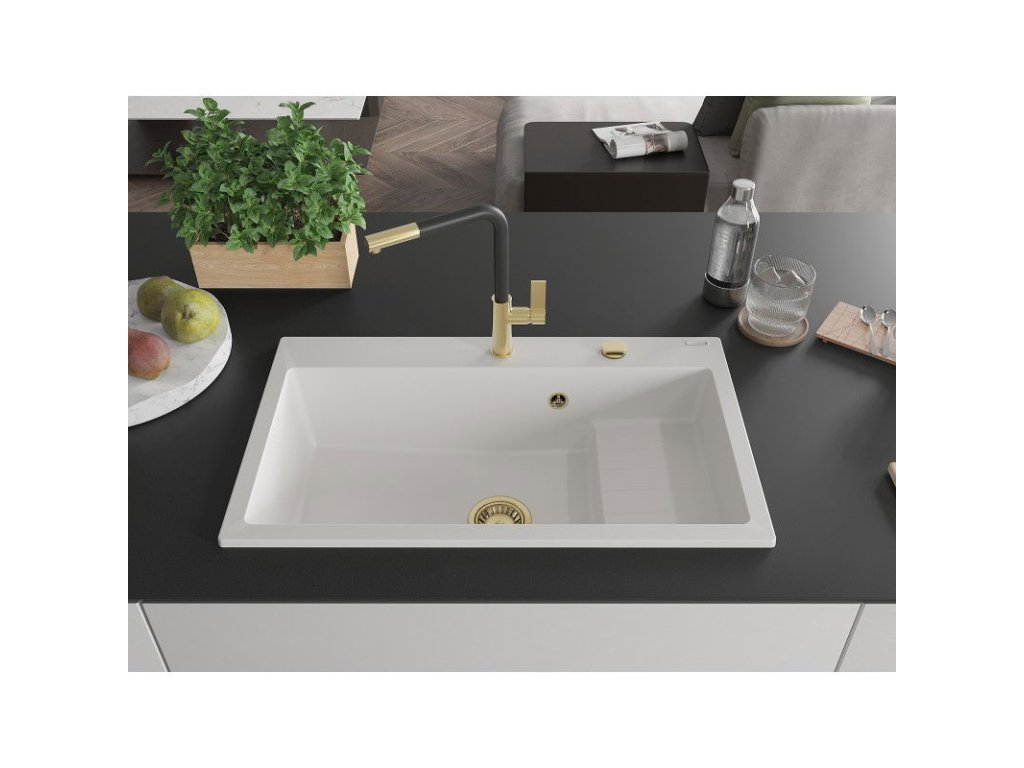 Granitový drez Mexen Omar s 1 misou 800 x 480 mm, biely, zlatý sifón - 6520801005-20-G