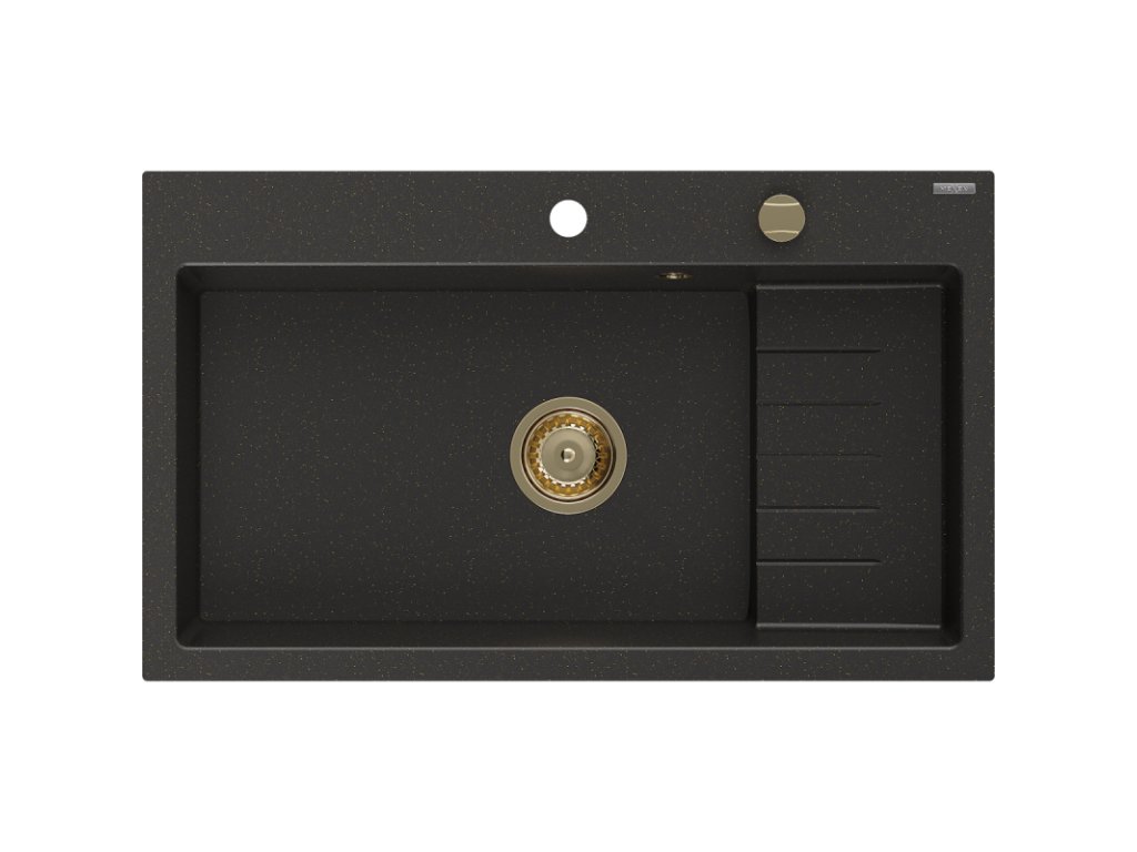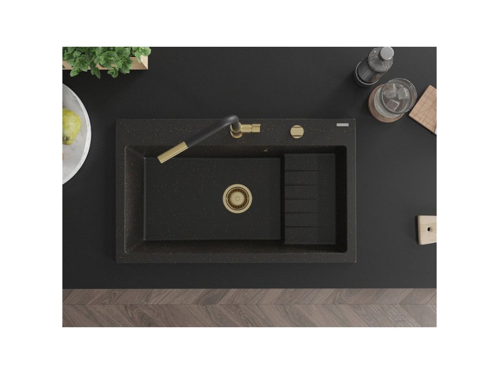 Granitový drez Mexen Omar s 1 misou 800 x 480 mm, čierna/zlatá metalíza, zlatý sifón - 6520801005-75-G
