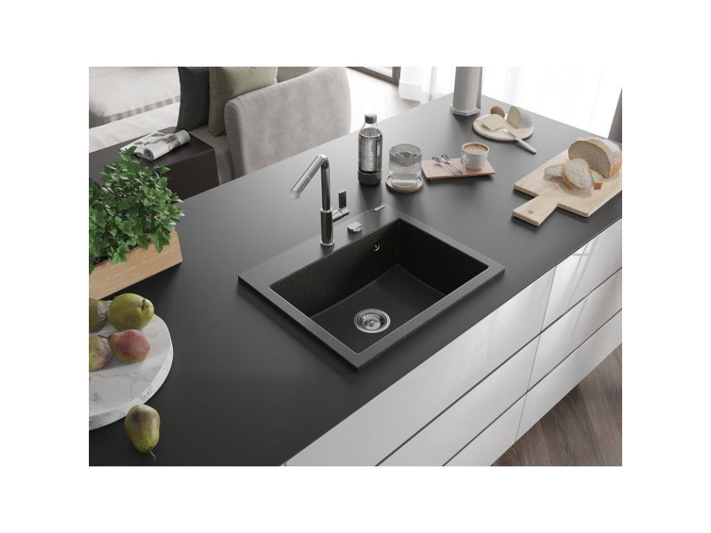 Granitový drez Mexen Oscar s 1 misou 580 x 490 mm, čierna/zlatá metalíza, chrómový sifón - 6519581000-75