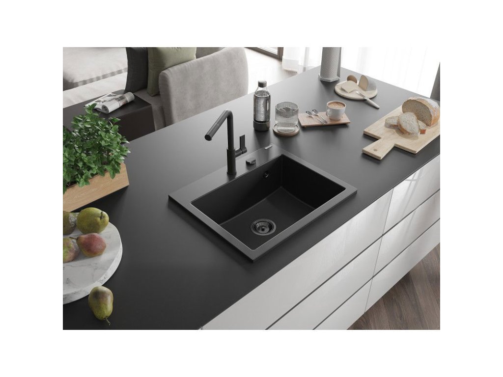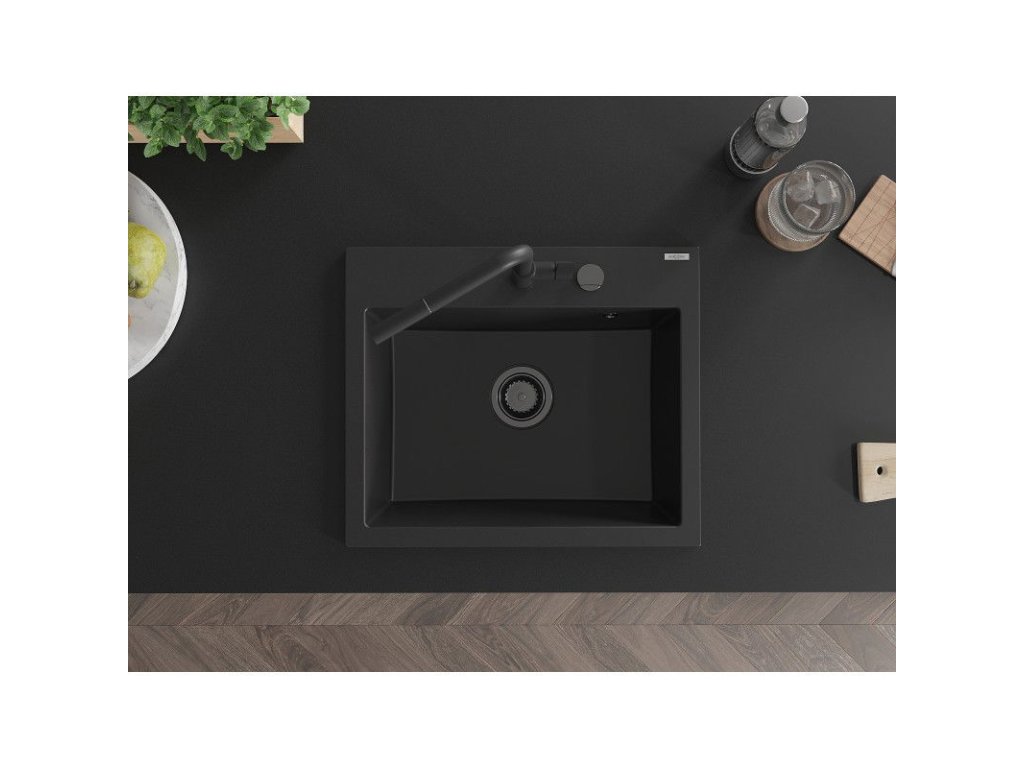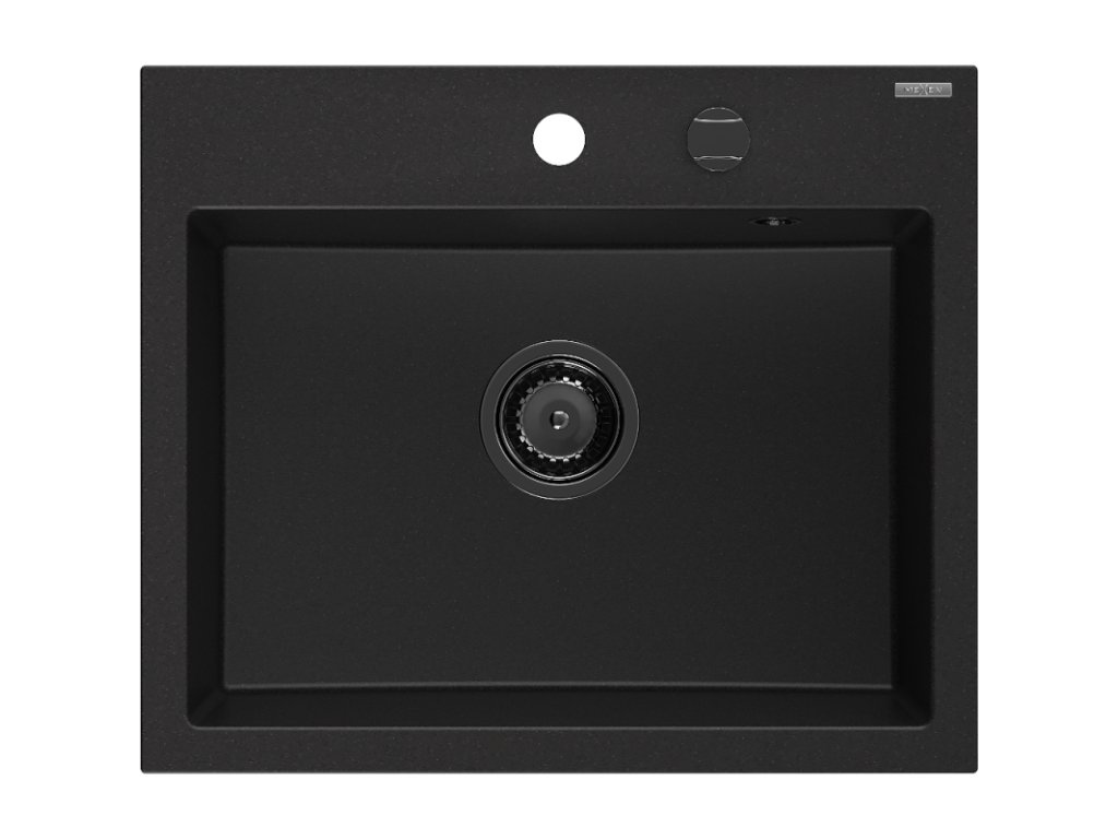 Granitový drez Mexen Oscar s 1 misou 580 x 490 mm, čierny, čierny sifón - 6519581000-77-B
