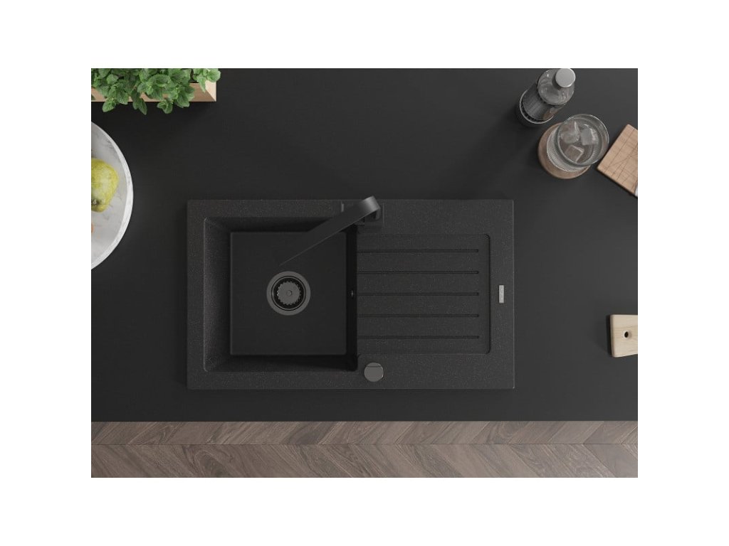 Granitový drez Mexen Pablo s 1 misou, odkapávačom a batériou Rita, čierna/strieborná metalíza - 6510-73-670300-70-B