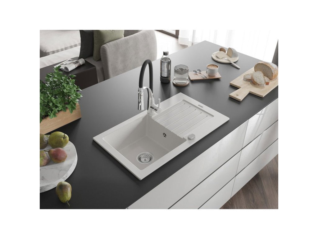 Granitový drez Mexen Pablo s 1 misou, odkapávačom a kuchynskou batériou Aster, biely - 6510-20-73450-07