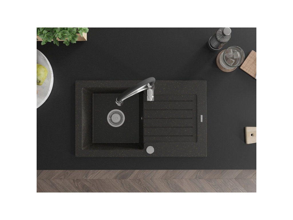 Granitový drez Mexen Pablo s 1 misou, odkapávačom a kuchynskou batériou Aster, čierna/zlatá metalíza - 6510-75-73450-07