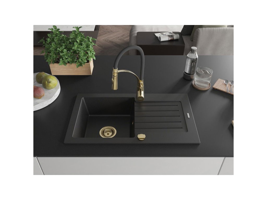 Granitový drez Mexen Pablo s 1 misou, odkapávačom a kuchynskou batériou Aster, čierny - 6510-77-73450-57-G