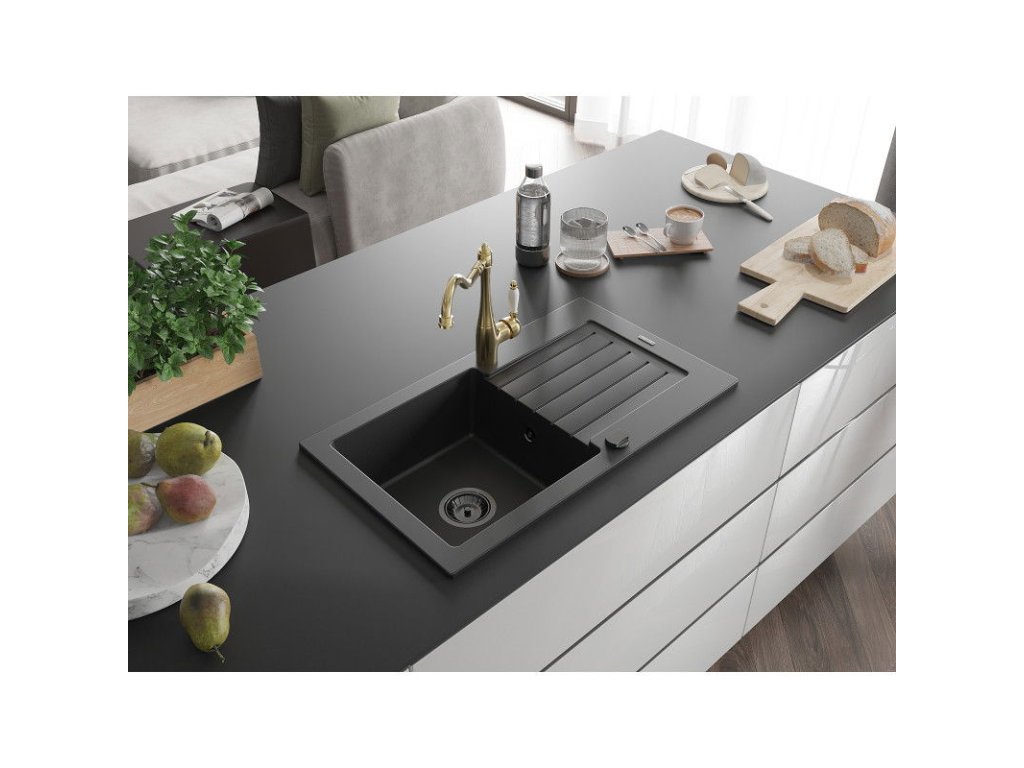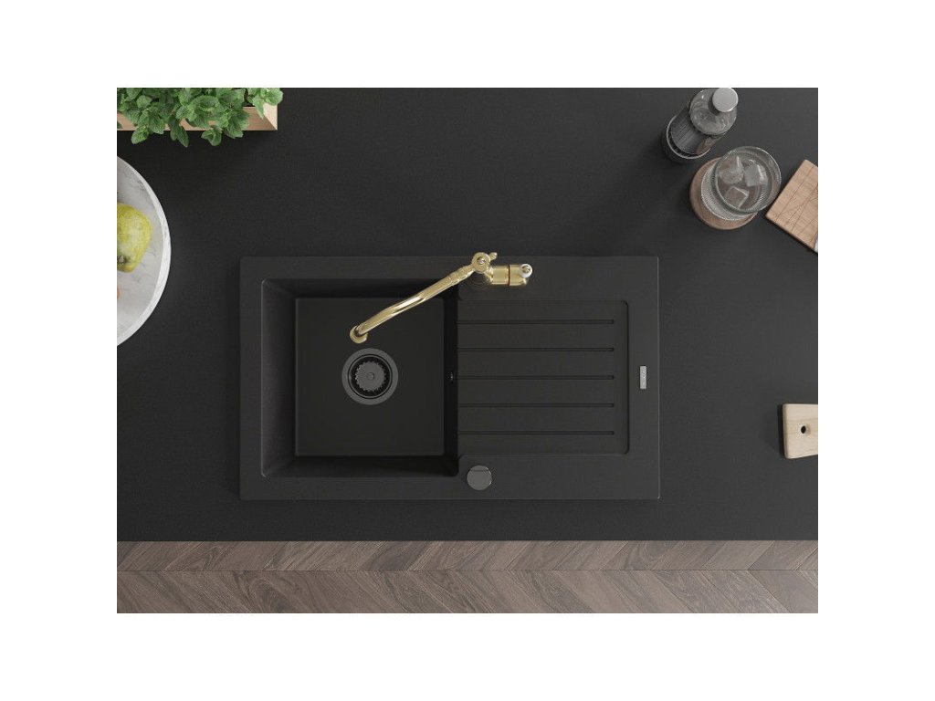 Granitový drez Mexen Pablo s 1 misou, odkapávačom a kuchynskou batériou Carla, čierny - 6510-77-670700-50-B