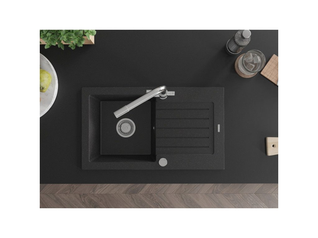 Granitový drez Mexen Pablo s 1 misou, odkapávačom a kuchynskou batériou Duero, čierna/strieborná metalíza - 6510-73-671600-00