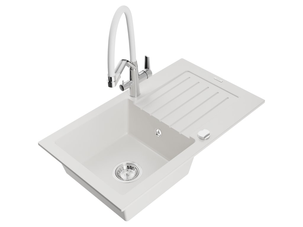 Granitový drez Mexen Pablo s 1 misou, odkapávačom a kuchynskou batériou Duo, biely - 6510-20-671701-02