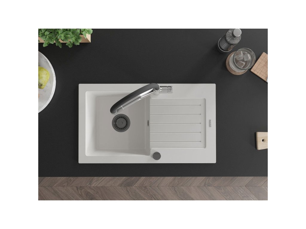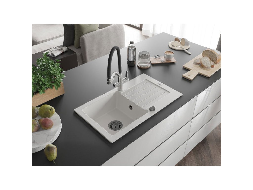 Granitový drez Mexen Pablo s 1 misou, odkapávačom a kuchynskou batériou Duo, biely - 6510-20-671701-07-B