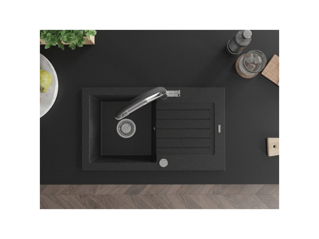 Granitový drez Mexen Pablo s 1 misou, odkapávačom a kuchynskou batériou Duo, čierna/strieborná metalíza - 6510-73-671701-07