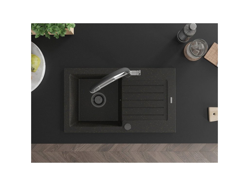 Granitový drez Mexen Pablo s 1 misou, odkapávačom a kuchynskou batériou Duo, čierna/zlatá metalíza - 6510-75-671701-07-B