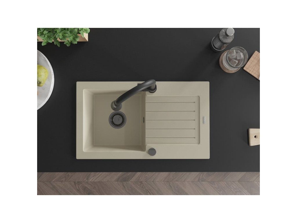 Granitový drez Mexen Pablo s 1 misou, odkapávačom a kuchynskou batériou Elia, béžový - 6510-69-670101-70