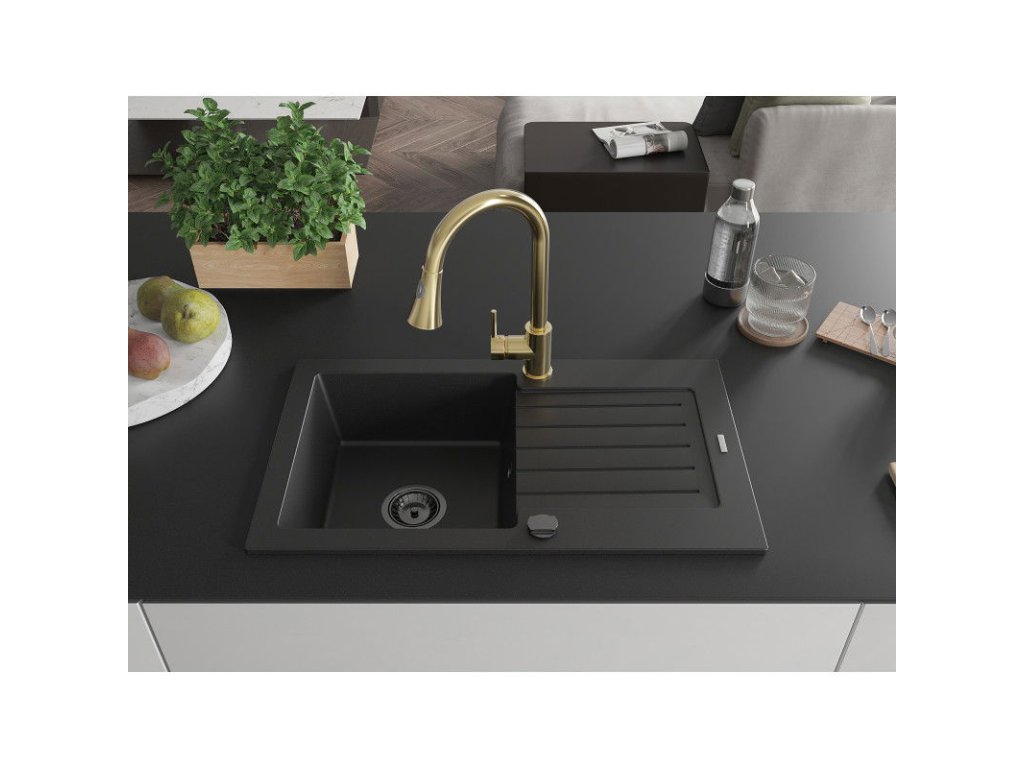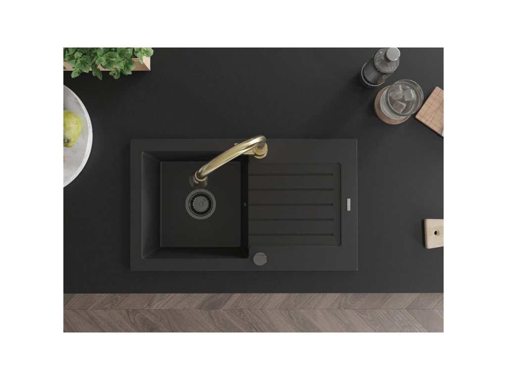 Granitový drez Mexen Pablo s 1 misou, odkapávačom a kuchynskou batériou Elia, čierny - 6510-77-670101-50-B