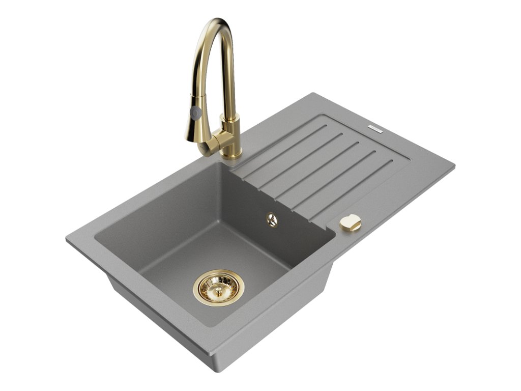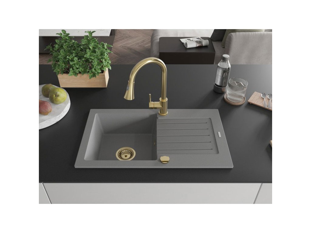 Granitový drez Mexen Pablo s 1 misou, odkapávačom a kuchynskou batériou Elia, sivý - 6510-71-670101-50