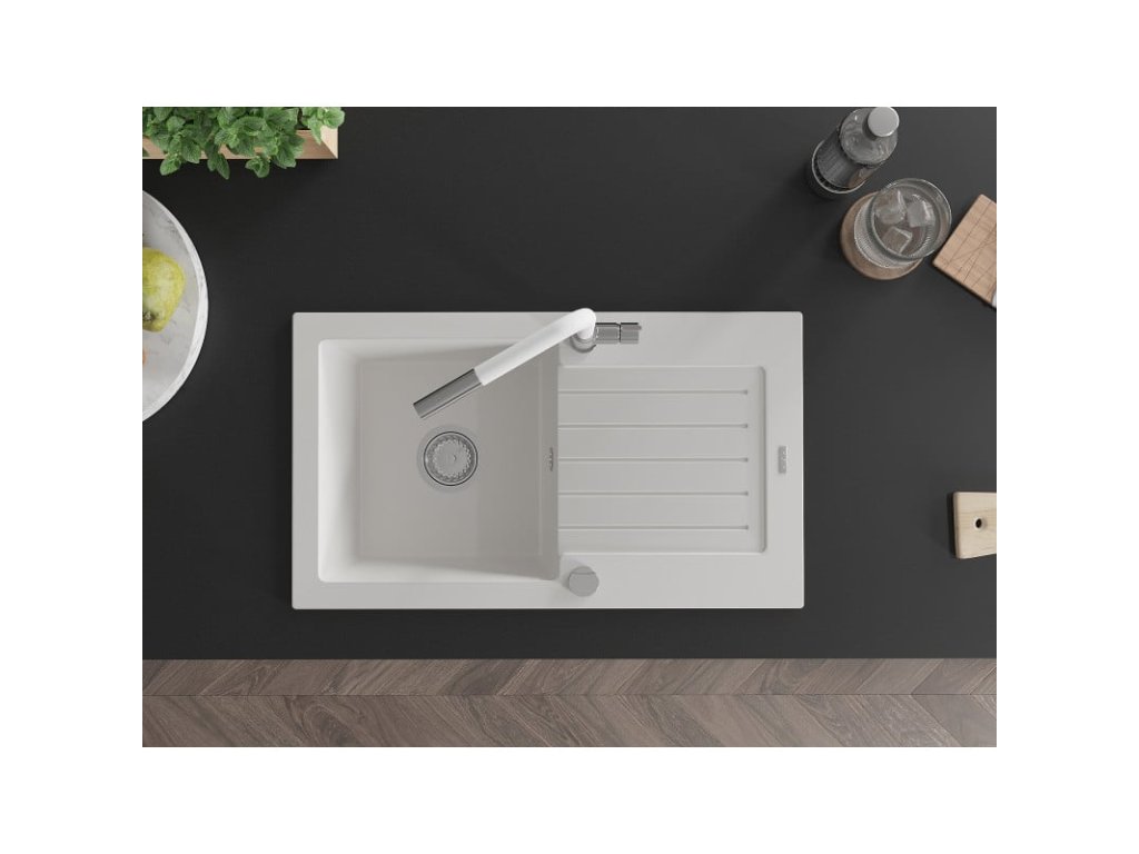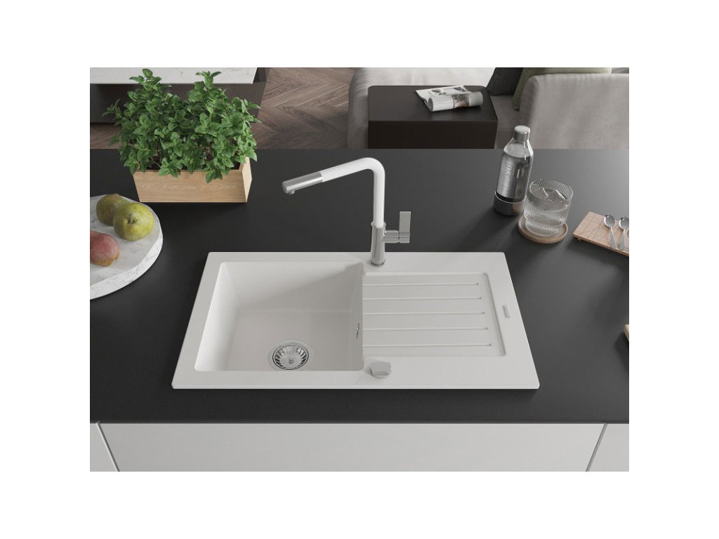 Granitový drez Mexen Pablo s 1 misou, odkapávačom a kuchynskou batériou Flora, biely - 6510-20-670401-02