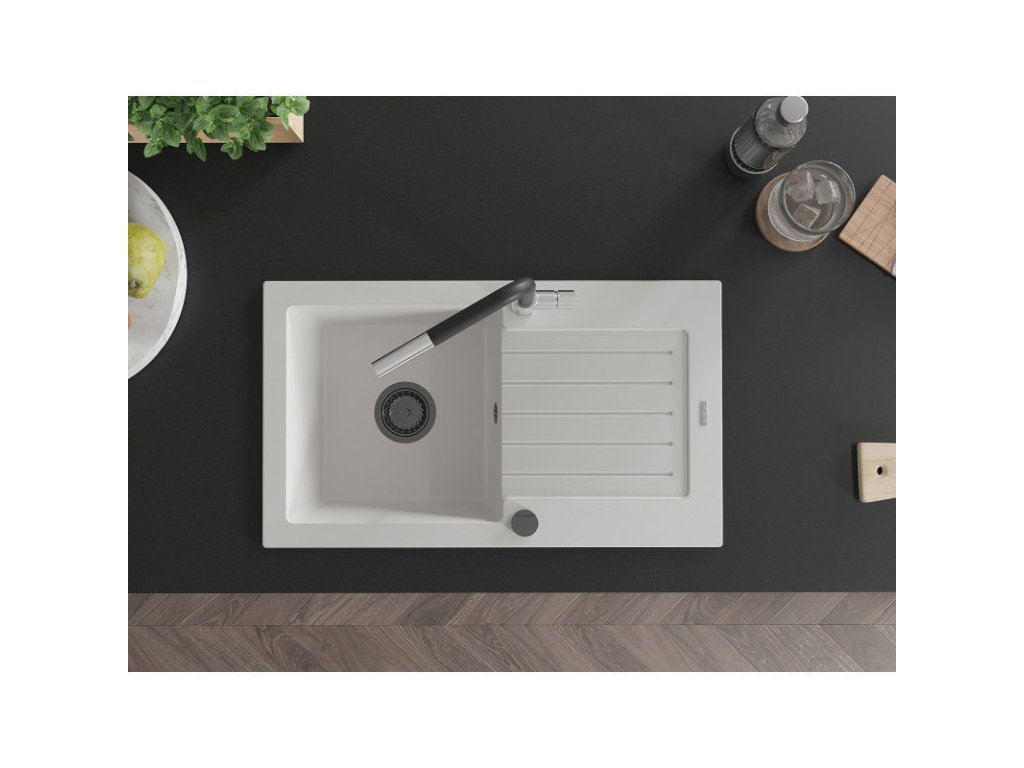 Granitový drez Mexen Pablo s 1 misou, odkapávačom a kuchynskou batériou Flora, biely - 6510-20-670401-07-B
