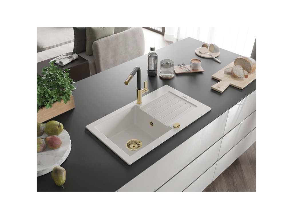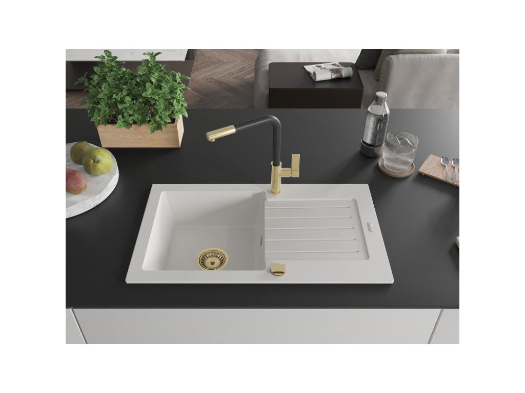 Granitový drez Mexen Pablo s 1 misou, odkapávačom a kuchynskou batériou Flora, biely - 6510-20-670401-57-G