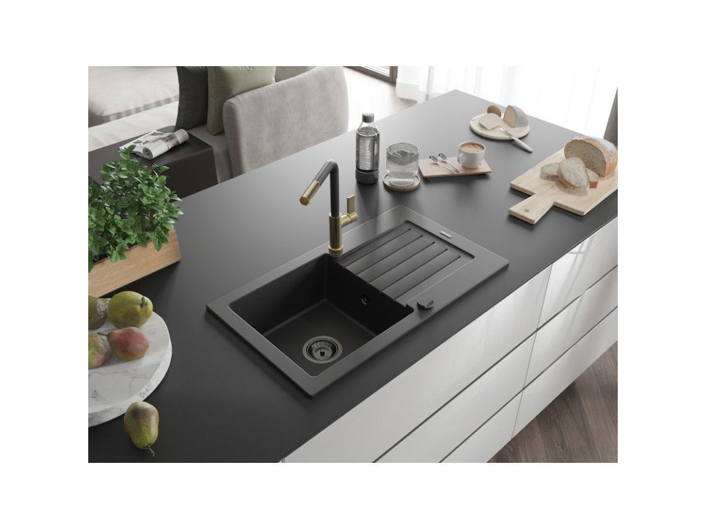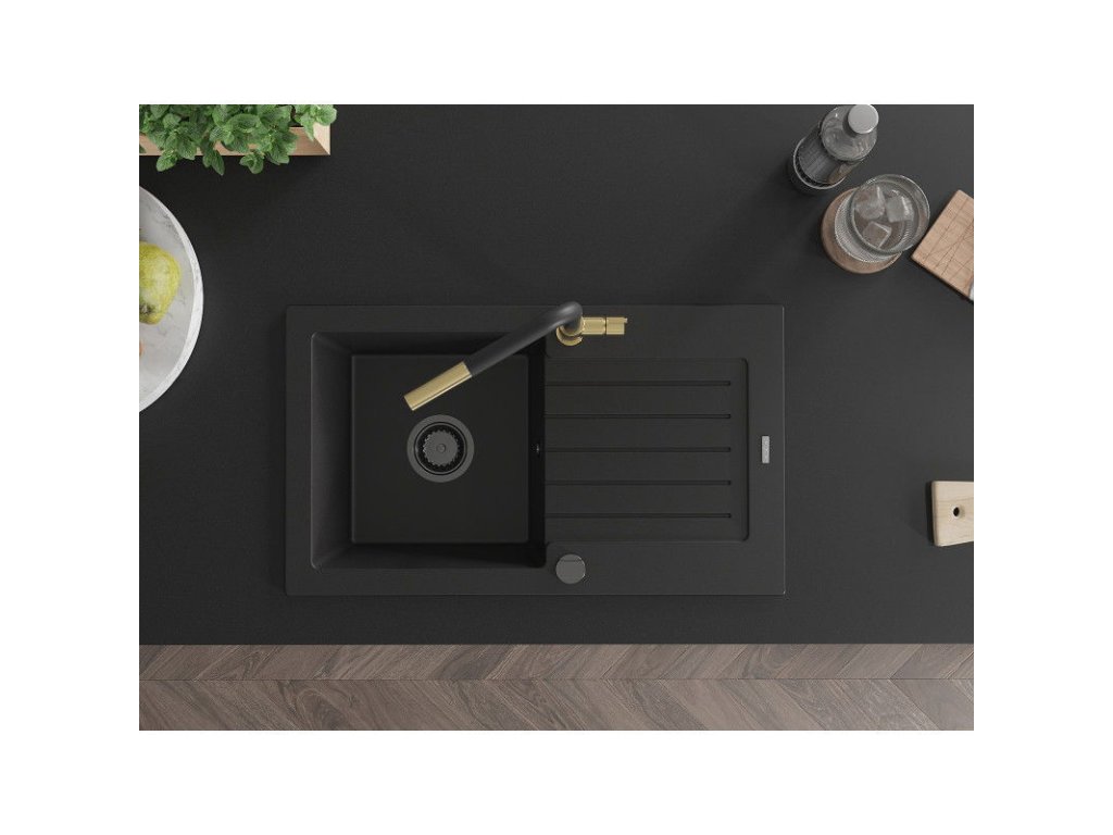 Granitový drez Mexen Pablo s 1 misou, odkapávačom a kuchynskou batériou Flora, čierny - 6510-77-670401-57-B