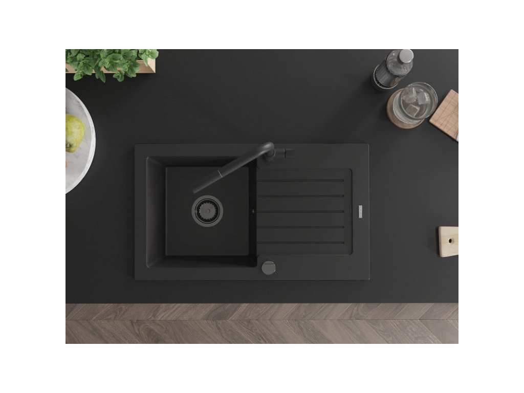 Granitový drez Mexen Pablo s 1 misou, odkapávačom a kuchynskou batériou Flora, čierny - 6510-77-670401-70-B