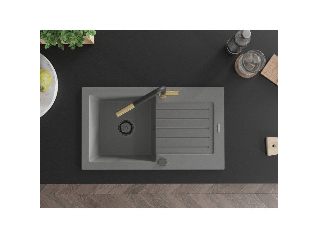Granitový drez Mexen Pablo s 1 misou, odkapávačom a kuchynskou batériou Flora, sivý - 6510-71-670401-57-B