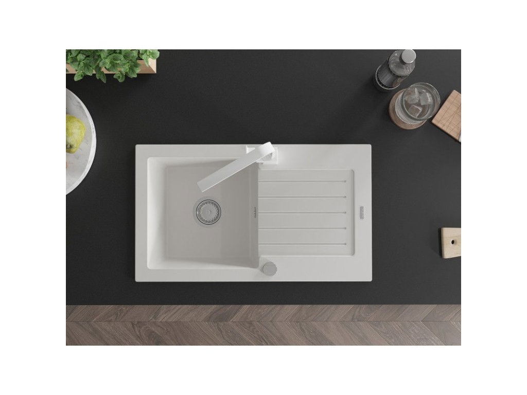 Granitový drez Mexen Pablo s 1 misou, odkapávačom a kuchynskou batériou Rita, biely - 6510-20-670300-20