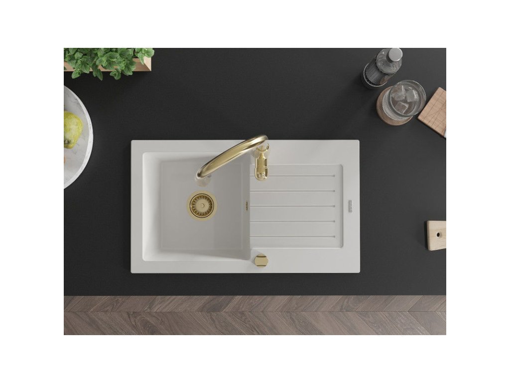 Granitový drez Mexen Pablo s 1 misou, odkapávačom a kuchynskou batériou Savita, biely - 6510-20-672601-50